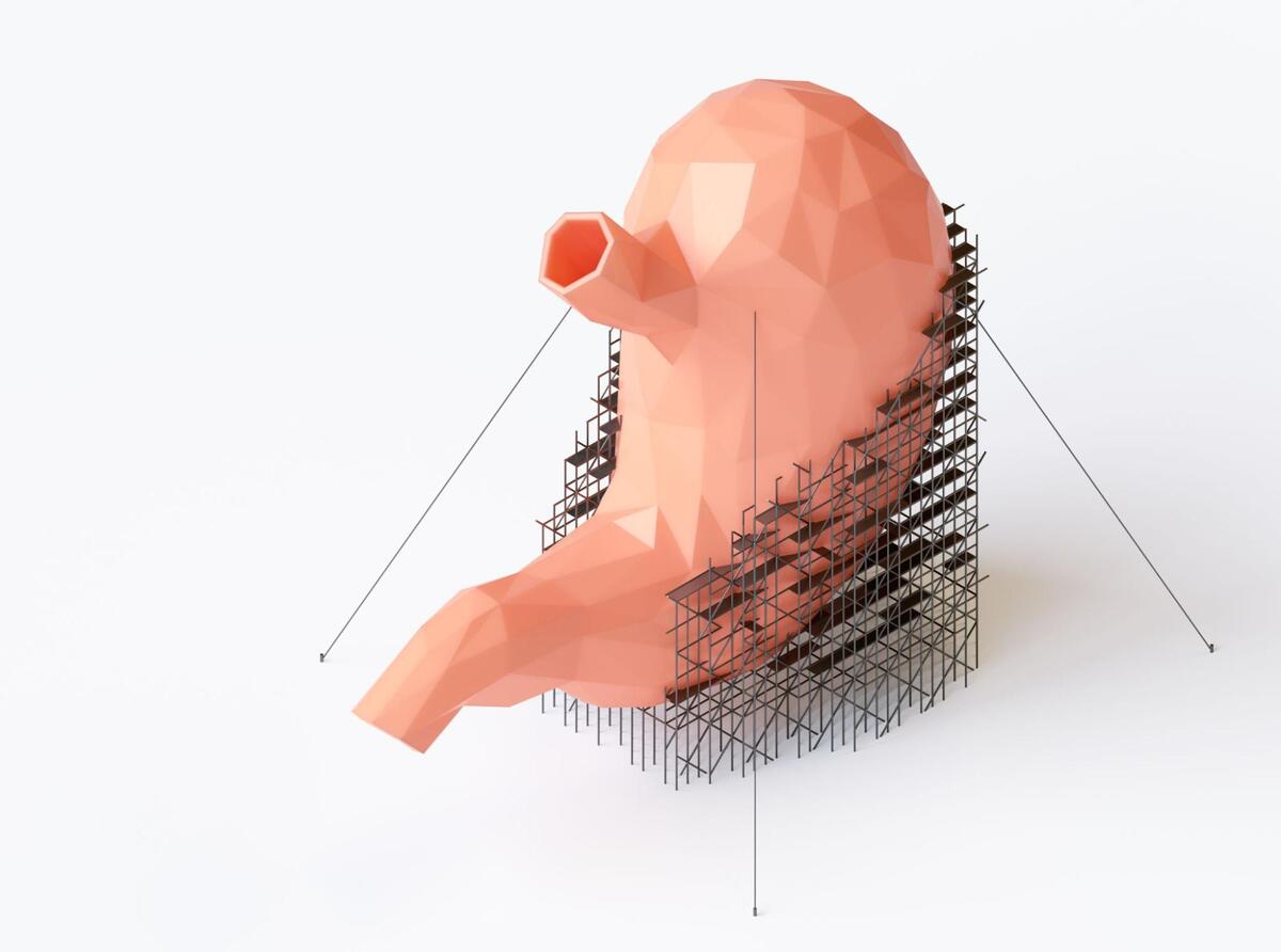 胃の中の様子とそれを3人の医者が観察しているイラスト
